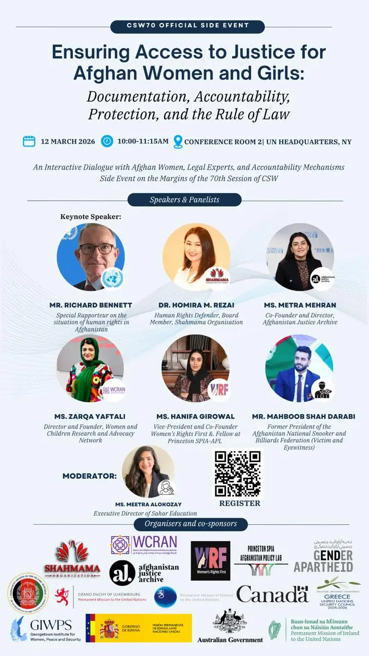 Addressing CSW70, the statement warns that Afghan women face one of the world’s most severe systems of institutionalized discrimination. It urges the international community to reject normalization and advance legal accountability, including recognition of gender apartheid.