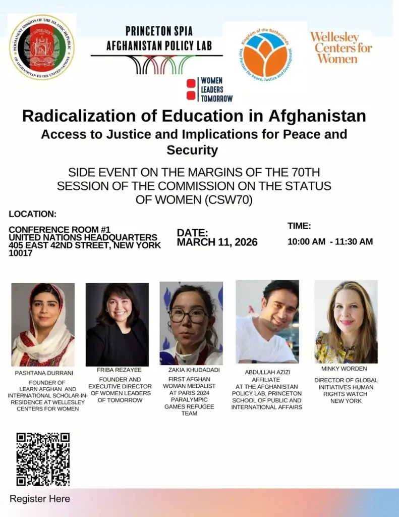 • The first event, entitled “Radicalization of Education in Afghanistan: Access to Justice and Implications for Peace and Security,” will take place on Wednesday, 11 March 2026, from 10:00 to 11:30 AM in Conference Room 1, United Nations Headquarters, New York.